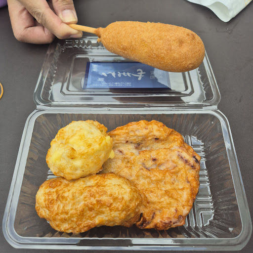 My favourite food in Himeiji!! The cheese fishcake (round ball) was the best, generously packed with cubes of soft savoury cheese and fishcake. The other fishcakes are worth a try and packed with ingredients such as chunks of squid. Recommend the squid and the top 5 items in the chart at the cashier. The cheese corn dog was passable as the dough was thick.