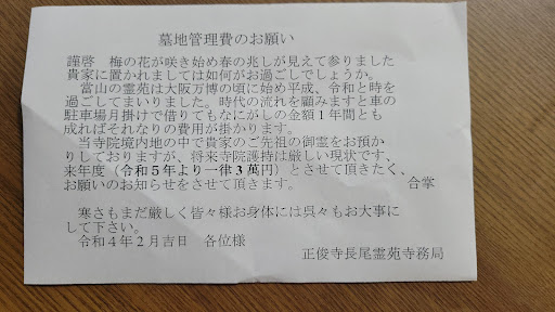 お墓参りする人の事は考えてない寺。 墓地管理費が令和5年よりいきなり今の倍の3万になるとお知らせがありました。 管理費?いったい何を何処を管理されてるのでしょう?読んでて腹がたってきました 駐車場は無整備のキツイ坂の下で遠く、暗く汚く怖い入りたくないトイレ(最近新しいトイレができたみたいです)いつも汚く水が無い状態の手水舎、墓地は放ったらかし枯れた墓花すら撤去してもらえず、墓地のまわりは土で雨が降ると水溜まりになり靴が泥だらけに。草木も鬱蒼と生茂って放ったらかし放題で枝が顔に当たります お墓参りする人の設備が何一つ整っていないのにやたらある石像(正直不気味)やお寺に合わないキャラクター像など、お寺側の施設は本堂も隣の住まい?も新築や建て替え境内の庭園造りなどここのところ目まぐるしく思い失礼ですが余計な所にお金をかけすぎてる様に見えます。三万円はなかなかの金額。 駅近とは言え長尾の田舎寺なのに大阪市内でもないのに高すぎます 義親から自動的に受け継いだお墓でこの先また何年かしたらまた値上がりしていくのかと思うと憂鬱になります。 今後益々墓離れが増えていくでしょうね… 実際、前に比べたら墓地の空きが増えた様に思いますそのシワ寄せでしょうか 少しは木の剪定...