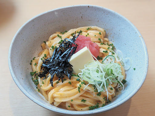 わたしが頼んだのは、たらこ釜バター 『十六代真っ赤卵』(卵黄のみ)は、すでに うどんに絡められている状態での提供。 バターとたらこを少しずつ混ぜながら いだだいた。野菜が皆無なのでねぎ追加。