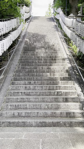 小山の上にあり、正面階段が急傾斜で、上りでは使いますが、帰りは別ルートを使っています。 一度本殿を焼失したことがあり、建て直しています。その際、頂上部分を切り拓き、少し低くして面積を若干拡げています。