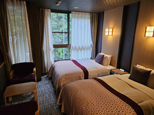 We found a good deal on the web site, which included discounts for having proof of vaccines, plus coupons totaling ¥8,000. I think the coupons were part of the "Go To Travel" campaign. These coupons could only be used in Oita prefecture, by the next day. The hotel has a grand, luxurious appearance and feel, but also feels dated. After check-in, we took the shuttle bus to the outside onsen (about 5 minutes away). This was included in the price (I am not sure if it is actually owned by the hotel. There is a fee for people who are not staying at the hotel). This onsen was glorious! All the baths are outside, surrounded by trees and nature. The only caveat is that there were many stairs going down to the onsen. I did not expect that at all, and it was not easy on my knees (no problem for my partner). The other onsen in the hotel (there were two) also involved walking (it is as large hotel), and some stairs too. The floors in the onsen seemed more slippery than I remember any other onsen I have visited before. ||||Dinner was buffet style. Due to COVID restrictions, we had to get our temperature checked, and wear plastic gloves while serving ourselves (there was a box at the table, and a container for disposal of them). The seating was partitioned, and it was very comfortable. Even though it was a buffet, there were 3 choices for seating: 5:00 pm, 6:30 pm and 8:00 pm, with a 90 minute limit. The food was good, but my partner had to stand in line at a station for freshly prepared meat for 30 minutes. Breakfast was served in the same place as dinner. ||||We got a lower-priced deal, and our room was on the 1st floor. The hallway was a little dark compared to the other floors (which we had to access for the front desk/entrance to the hotel and to get to the dining area and the onsen). To me, there was a musty smell that my partner did not notice. The place is older, and it is right next to the river, and it was the middle of Japanese (humid) summer, and I assume not all the rooms are like this. There was a can of roach spray in the closet (which thankful we did not need!), and requests not to open the windows to prevent bugs from getting in the room. The sound and site of the river outside the window was wonderful. The beds (two twin beds) were comfortable and we got a good night's sleep. ||||It was my partner's 50th birthday, so we mentioned this to see if they had any thing special (even for an extra charge). They gave a card and a plastic rose (I think the rose was for the birthday), but said they did not have anything else. ||||The water pot already had hot water in it when we arrived. I appreciate that. They also had the kind of coffee in which you open the single pack, put it over the cup (good size, not tiny like some places) and pour hot water on it (like a one cup drip coffee- not instant). I often travel with these types of coffee packs as a lot of hotels in Kyushu only have instant coffee or none at all in the rooms. ||||The room has the standard yukata (there were 4 sizes in our room) which is common to wear to dinner or while walking to and from the onsen. Also, the standard amenities- toothbrush, hairbrush (plastic), shower cap, room slippers (not disposable) are in the room. Since it is an onsen hotel in an onsen town, we did not use the room's shower or tub. The onsen provides body soap, shampoo and conditioner. It seems these were all made with horse oil, which is popular in the area for skin care too. (We did not have it, but the area is also famous for horse meat). I just thought I would mention that as I am sure some people would prefer not to use it. One of the onsen was open all night. We did not use it in the middle of the night, but I liked having that as an option!||||There is adequate complimentary parking (you can drop your luggage off, as you might have to walk from the parking a lot just a little. I do think there is any access besides car (but I am not sure on that). ||||The hotel straddles two prefectures, Kumamoto and Oita. You can stay in either Kumamoto or Oita!||||Go for the included meal plan. There were no other open restaurants at the time of our stay, and nothing seemed to be in the area. ||||Besides the onsen, the staff were one of the best features of the hotel. Friendly and professional. All and all, to sum up, it is a great place, but it is not "new", which is typical...