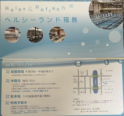 Read moreプールは4部制。更衣室にシャワーが3台あり、荷物は100円コインロッカーに預けるシステムです。利用後に100円は戻ってきます。青、緑、ピンク、黄色のビート板が利用できます。腕につける子供用の浮き輪もあります。子供用プールと25mプールの2つです。25mプールの真ん中は3つのレーンがあり、25mを止まらずに泳ぐ専用レーンになっています。 毎月15日前後に定休日がある。プールは2時間利用で300円とお得感満載。6枚綴りの回数券1500円にすればさらにお得。駐車場も広くて良い。入浴やサウナ施設もあります。2階建て。本数は少ないが、福島駅東口から路線バスもある。入り口にはコロナ用のアルコール消毒液や、検温器もある。券売機が新しくなってました。クリーンセンターの建て替え工事のため、南側の駐車場がなくなりました。北側と...