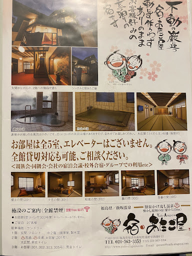Read moreお宿全体造りが立派で素敵な素泊まりお宿でしたし偶々、私達だけで広い男風呂を貸し切りで利用させて頂きました飯坂温泉はお湯が熱々なのでこれは嬉しかったです お部屋とても広く綺麗だしお布団も綺麗、洗面所も新しくトイレもウォシュレット冷蔵庫もテレビも大きく金庫もあります 歯ブラシ、小タオルバスタオルと全て揃っていて静かなお宿は快適でした 私達にとって残念だった点 1、フロント横階段から2階に上がる途中に調理場があり部屋が三階なので遠い事 自炊宿には慣れているので朝ご飯の食材を持ち込んでいましたが断念しました でもこれは私の予習不足、調理場には一通り揃っており広く使いやすそうでした 2、お風呂の時間が11時までと6時からでふとお風呂で暖まりたくても時間が…で何度か断念した事 後は料金がもう少しお安いと嬉しいかな その他は全て完璧な素泊まりお宿です 町散策しながら共同浴場を利用して有名な円盤餃子食べて地酒呑んでラジウム卵買って楽しい思い出が出来ました ただ思っていたより温泉街が寂れており廃屋旅館などもあり平日のせいか営業してるお店が無くお茶したりお土産や買い物したりが...