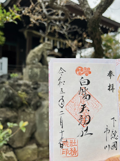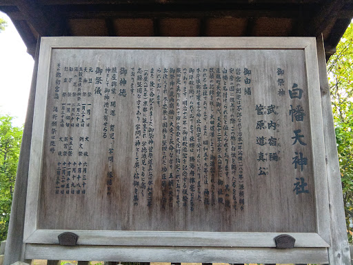 Read more八幡の静かな住宅街の中にある神社。京成電鉄八幡駅から、徒歩10分弱。駐車場も数台分ある。 旧社格は「村社」で、整備された鳥居・参道の奥に、拝殿・本殿を持つ立派な神社である。日曜日に参拝したら、巫女さんがほうきで境内を掃き清めておられた。社務所にも神職が常駐しているものと思われる。 「天神様」(あとから合祀)なので、いまは「文系」なのだが、「白幡」は源氏の旗の色であり、根本社はおそらく鎌倉にある源頼朝を祀ったものだと思われる。