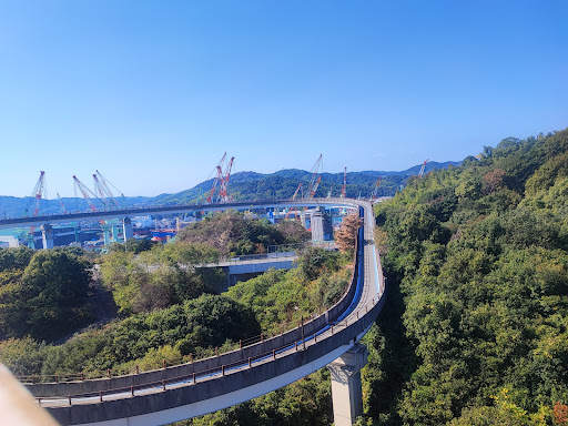 来島海峡大橋のぐるぐる回る傾斜路のところから圧巻の赤白クレーンが沢山並ぶ今治造船の敷地がよく見えます。船を作っている所は普段なかなか見れないので工場見学感覚でじっと見ていられました。 日本で1番、新造船の建造量が多い造船会社みたいで、国内シェア3割を占めるみたいです。 高校地理で学習した瀬戸内の穏やかな海では造船業が発達しているというのが一目で実感できました。 2023/11/01 訪問
