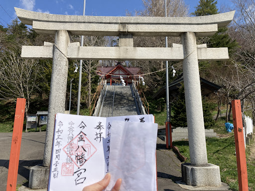 今金(いまかね)町今金にある八幡神社を訪問。国道230号沿いの街の中心にある大きな神社。左は町民センター、右奥に産業センター。白い第1鳥居、アスファルト道路の参道、車が通る。白い第2鳥居、右には幼稚園と間違えるようなイラストが壁に描いてある北海道開発局函館開発建設部函館農業事務所今金分庁がある。第2鳥居をくぐる。左に宮司さんが居る大きな社務所、土俵、事故で損壊した古い第1鳥居。右に大きな手水舎。長く広い石段を上がる。大きく立派な社殿。左に参集所、右に御札授与所、忠魂碑、ユリ・サルビア・アジサイなどの花咲く花壇あり。 ☆祭神 ・応神天皇(おうじんてんのう) ・神功...
