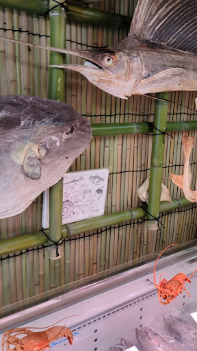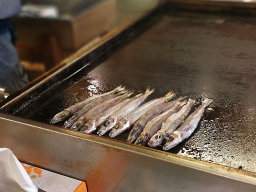 店の真ん中で試食の干物を店員が焼いていて、客は左側から入り商品を見ながら試食をして右側から出て行く流れになってます。欲しいものがあれば購入となるようです。