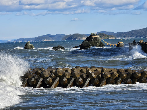 Read moreIn the winter, it's very cold and windy, but worthy. Not crowded on Friday afternoon. We took CAN bus from Naiku-mae to Ise Sea Paradise -mae, approx. 26 minutes, then passed through a carpark, and Futamiura Jinja Shrine. The Wedded Rocks were in the sea off Futami Okitama Jinja Shrine. The 9-meter husband rock and the 4-meter wife rock are joined by a Shimenawa (thick rice straw) rope. It the past, Japanese thought theres rocks were a gate separating the divine world from the human world. Now, they represent happy marriage. The rope will be renewed every May, September, and December. From May to July: The sun rises exactly between 2 rocks. From November to January: The full moon appears between 2 rocks