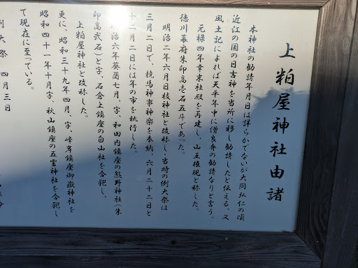 Read more上杉定正の館の守護神社であった、とある。 今は上粕屋神社とあるが、山王社、山王日枝神社と称してきた。 良弁僧正が大山寺を開創したときに勧請し、毎年12月20日には社地の中で年の市がたったという。 社の裏手にまわると、館の空堀の跡があるとのこと。 ____________________