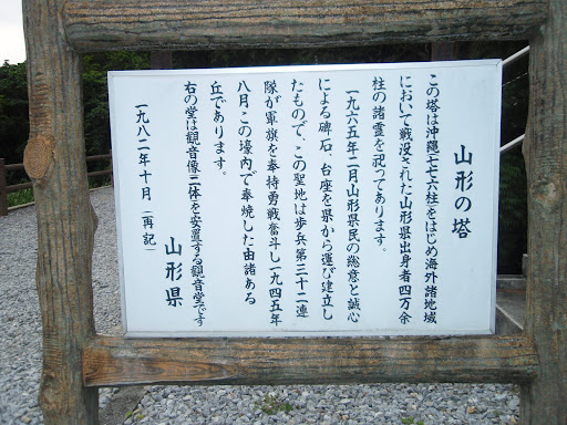 Read more沖縄地区の戦死者以外にも大東亜戦争で戦没された山形県出身の方およそ40000人の戦没者を祀った塔です。直近に山形県の郷土部隊である歩兵第32連隊の碑もあります。山形県民であるないにかかわらず、すべての日本国民に訪れていただきたい場所です。けして戦争賛美とか肯定の立場で申し上げているのではありません。私はすべての日本国民は大東亜戦争のすべての戦没者の遺族だと思っています...