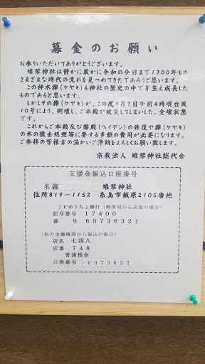 昔神功皇后高祖より御坂(三坂)を経て雷山に登り給い層々岐岳にて天神地祇を祀り戦勝を祈り給う後山をさがり(嵯峨里)給い此所に宿陣し給う夜夢枕に日本武命がたたれ賊徒討伐の法を教えられたという 雉子の鳴く声を琴の音に聞きて目ざめられ帰還の後日本武命を祀り雉琴神社と崇め奉り此所を雉琴と名付けられた (古事記神社縁...