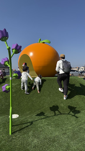 その奥には広々とした遊具のあるフルーツ公園が広がっていて 子供達が楽しそうに遊ぶ姿が見られました。 公園のあちこちにフルーツの形をしたオブジェが置かれています。 周りには住宅街が広がっているので 休日の遊ぶ場所としても魅力的なよってってだなと思います。