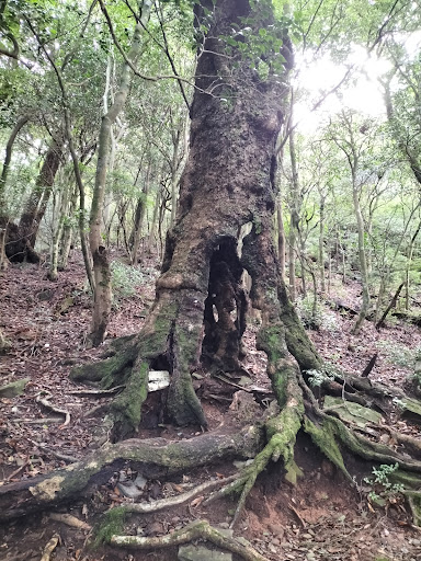 ■登山道:全体的に整備されているが、数回登山道から逸れてしまった。⇛悩ましい箇所あり。 とは言え、それ以上に先人の「石積み(登山道目印)」のお陰でコースアウトとならず助けられました。(感謝) 途中に「千年樫(がしら)」と命名されているアカガシの穴あき巨木がある。 平谷越手前の鎖場で気持ちが引くも…冒頭記載の経ヶ岳山頂への鎖場を経験して鎖場レベル上がると帰路ではそれほど気にならなくなる。