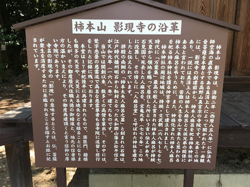 Read more令和6年4月29日参拝 第7回万葉ウォーキング出発地 祭神は柿本人麻呂。御神体は柿本人麻呂像で、同じ敷地内の影現寺(ようげんじ)を創建したという紀僧正(真済しんぜい)作と伝わる。 旧村社で、社伝によると宝亀元年(770)石見国で死去した人麻呂の遺骸をこの地に葬り、その傍らに神社を建立したとのこと。命日は伝承で旧暦3月18日とされ、現在の例祭は4月18日に執り行われている。 境内左奥に万葉集の巻11 2453の万葉歌...
