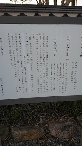 Read more真言宗智山派の寺院で、江戸初期寛文年間(1661~1672)祐圓の開山(寺の創始者)、山門は明暦2(1656)年の建立です。境内のヒバは祐圓お手植えと伝えられ町内第一の巨木であり、本堂の千手観音は常に扉を閉ざした厨子に安置され秘仏とされお姿を拝することができなかったことや、以前参道が松並木で昼でも暗かったことから『まっくら観音』として親しまれ、安産・子育てにご利益があるとされ、8月9日の縁日は多くの人で賑わっています。本堂に鎮座する三躯の仏像は、河内町文化財に指定されています。10台以上駐車可能な整備された駐車場があり、隣接する土師神社...
