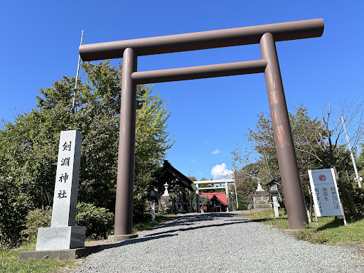 2024.09.22 ・秋晴れの清々しい気候、小高い土地の静かな境内に大きめの鳥居がどっしりと構えています。 ・鳥居くぐるとすぐ左に、少し古めのどっしりとした手水舎がありました。手水鉢は石をくり抜いたタイプです。 ・少し小さめの第二鳥居の先に社殿が見えます。参道はストレートタイプです。 ・社殿は赤い屋根に赤みがかった木の色が調和していて統一感があります。流れるような字体の社額も格好いいですね。 ・社殿の中はコンクリートの床でしょうか。少し古めの室内ですがきれいにされています。 ・太鼓の手前には、鳥の剥製のようなものがありました。気になります。 ・参拝の記帳簿の横に書き置きの御朱印が置いていたようですが、品切れていました。 ・剣渕神社からいただいた御朱印です。細字で味のある特徴的な字体です。宮司さんは愛別神社と兼務しているという話を聞きましたが本当なのでしょうか。気になるところです。 ・初穂料は賽銭箱の所に500円と書かれていたため、奉納させていただきました。 ・あたたかい午後の参拝です。天気もよく穏やかでした。剣淵町から神社へ続く農道のような道路も真っ直ぐ延びていて気分がいいものです。本日は参拝される方もいなく少々寂しい感じもしましたが、この天気のように平和で温厚な日々が続け...