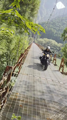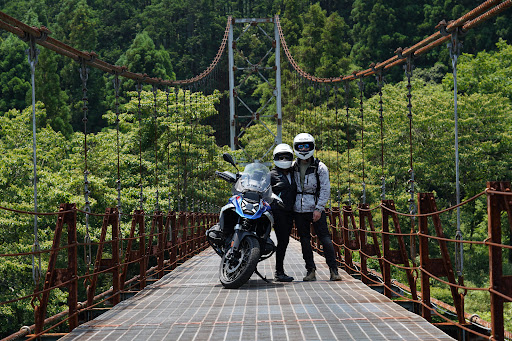 Read moreスリルある吊り橋。 バイク初心者は、あまりオススメできない。 ゆっくり走って通るだけでも、かなり揺れます。よそ見厳禁です。 道の駅側から渡ると左上に上がる坂になっていて、旧道と合流するところで転回できますが、 自信のない方は降りて転回するか、足つき転回(少々勾配アリ)するかしてください。 橋の上での撮影は可能ですが、地元の方優先しましょう。 バイクを停める際、網目ではない、ところどころにプレートがあるのでそこにサイドスタンドをたてます。 慌てずゆっくり歩いてください、橋も揺れるし、バイクが倒れそうと思うくらい揺れます。