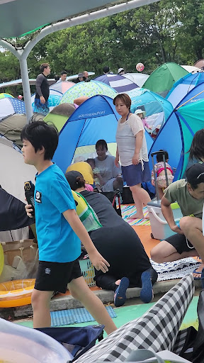 100cm以上のバルーンは持ち込み不可。 ワンタッチテントの持ち込みはオッケーというかむしろ必須。プールサイドに運動会のシートレベルの密集で立ち並ぶのでわかりやすい目印でもつけたほうがいい。 プールサイドなのでペグは打てない。重めの荷物を各隅に配置して代用しました。風で結構ひっくり返ってるテントあり。