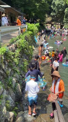 Read more2024/8 多度峡天然プール 暑い日が続き子供とプールに行くのも飽きてきたので、川で遊べるとこが何処かないかな?と探していたらありました。夏の期間だけ川をせき止めて川プールになるとこ発見。川遊びはよく水難事故が起きるので危険なのですが、川プールなら、管理されてるので子供でも楽しく遊べそうです。三重県の山奥、多度神社付近にある様子。行ってみましょー!✊ 付近に着いたのはちょうどお昼頃でした。しかし、山の細道に渋滞の列が😱。待てども待てども進みません。結局1時間位待ってようやく第2駐車場に入れる事に。長ぇ~😩。 車の中で着替えて、そこからは徒歩で川プールに向かいます。第1駐車場はもっと川プールに近いとこにありますが、運転に自信の無い方はお勧めしません。第2駐車場から川プールに向けて歩いても10分位だったと思います。川見ながら歩いていたらすぐです😄。それよりもその道中の道幅が極狭ですね。車1台しか通れないです。プールに行く為人が歩いてますが、人いたら横通り抜ける事も出来ない位狭いです。第2駐車場で良かったと思った瞬間でした😅。 川プールに着くとネットで見た通り凄い人🤣。とりあえずシートを敷き、荷物置き場を確保して、川プールに行きます。やはりプールとは違い水が冷たいですね~🥶。めっちゃ肩まで入るのに時間かかりましたが、慣れるとめっちゃ気持ちいいです👍。 川の水は人が多過ぎるのもあり、綺麗なんだろうけど濁ってます😅。塩素消毒してない水で濁ってるので顔を付けるのは躊躇しますね。ピロリ菌いるかもしれないし...😑。 肝心の水深ですが、せき止めてある付近は大人の腰あたり90cm位かな?川プールの真ん中辺りで膝辺り50cm位になります。うきわの持ち込み出来ます👍。川の底はゴツゴツした石がゴロゴロとあるので素足は絶対やめた方がいいですね。マリンシューズ持っている人は持ってく事をオススメします😄👍。私達は普段履いているスニーカーを履いてそのままプールに入りました。それで丁度いいくらいです。天然プールの下流側にも上流側にも散策行けます。小さな魚🐟は泳いでいましたし、タニシもいるし、サワガニもいるみたいなので、タモ(通じるかな?🤔虫取りの網の事です)や虫かごを持った家族も多くいます。下流側では、小さい子なら浮き輪に乗って川下りができます😄。ただ、川プールの濁った水が流れているので、浅いとこはキレイですが、少し深くなると、濁ってる感は否めませんね😅。後は、石がヌルヌルしていて滑って危ないと感じました。ほんとに気をつけて歩かないと滑って転倒します。私も足を滑らせ石の間に足先が入り、痛かったです😭。もし素足だったら、多分切れてます😣逆に上流側は水が綺麗で、こちらもチビッ子が浮き輪に乗っての川下りが出来ます。後は、大きな滝や小さな滝があったり、穴から大量の水が出てるのでその水を体でせき止めてみたりと色々楽しめました😄。個人的には上流の方が楽しめるかも😄。 飲食出来るとこもあるので、お腹がすいたらそういった所でご飯食べるのもありですね。 プールにはプールの楽しみ方がありますが、川には川の楽しみ方があるので、みなさんで色々工夫して遊んでみるといいかもですね。いつまでやってるのかは分からないので行く時に電話して聞いてみるといいと思います。子供もまた行きたいと言ってたので、また来てもいいなと思えるとこでした...