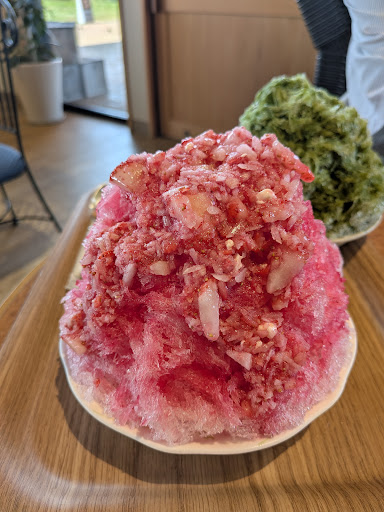 Read more長島アウトレット行ったついでに暑すぎ、かき氷看板があったので寄りました。 オリーブが売りの、お店、かき氷にオリーブ味?があり頼もうと思いましたが、味が想像でき無かったので、イチゴ味(950円)と抹茶味(850円?)を頼みました、 抹茶味は想像通りですが量が多く、食べていくうちに、身体が冷えて来ました。イチゴ味は、上に細かく切ったイチゴがのっており大分冷たい!あと食べていく、うちにアイス?生くりーむ?が入っており美味しかった。イチゴ味おすすめです。 外にはオリーブの木が立っておりスペインから、...