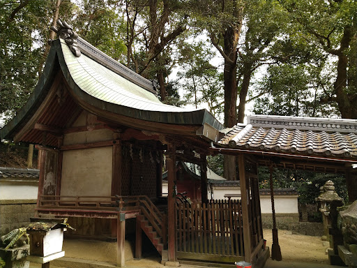Read more咋岡神社、京都府京田辺市飯岡東原。 主祭神=宇賀乃御魂神。菅原道真~旧称=天神宮。元禄8年(1695)、遷座。旧地=木津川と普賢寺川の合流点。 木津川沿い、広い田が広がる土地。丘上へ村、社叢へ鎮座。鳥居をくぐり、神域と出合う。社叢に囲まれ、大きな木に抱えられる。割拝殿、幣殿、本殿の構成だが、幣殿は拝殿として用いられている。本殿の前に門を設け、本殿の前は幣殿に相当する。 割拝殿は、瓦葺き、切妻造、五間、平入で、後ろへ幣殿をつなげ、同じく、瓦葺き、切妻造、妻入とする。 本殿は、銅板葺き、流造、一間、平入で、手前に扉が付く。以降奥は、幣殿部に見える。階段を設け、建ちものは、朱色に彩色されている。意匠は簡素だが、所々、組物に相当する表現や、脇障子を付ける。 境内社、本殿右~厳島神社=市杵島姫命、本殿左の左側~八幡宮=品陀和気命、本殿左の右...