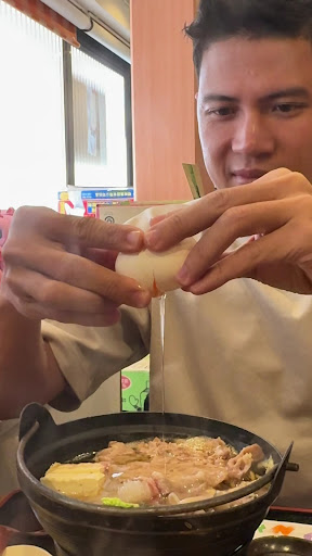 Chúng tôi gọi phần set lẩu sukiyaki kiểu Nhật, đi kèm: • Nồi lẩu nhỏ đun bằng lửa cồn tại bàn • Thịt bò thái lát mỏng, đậu hũ, rau củ • Cơm trắng dẻo • Một quả trứng sống để chấm thịt • Món trứng cuộn tamagoyaki mềm mịn • Canh miso và nhiều món phụ như dưa muối, rong biển