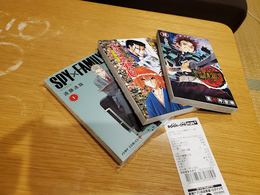 Looking for manga? This is the shop. Want the old stuff too like Rurouni Kenshin or Inuyasha? Yep, they've got it. They've got new stuff too like Demon Slayer and Spy Family. They have whole volume sets as well at irresistible prices, but I wasn't going to be able to fit all that in my luggage hahah. If you're into figurines they've got that too. The ones that were in display cases were quite expensive, but the ones on the shelves were priced pretty well. They've also got trading cards. I'm not good on gaging prices on those, so I can't say if they're a deal or not. I bought one of the Demon Slayer volumes for 110 yen. This place might be advertised as a used goods store, but I went up and down all of the manga aisles multiple times and let me tell you they were all in such good condition that I couldn't tell. Some of the volumes come neatly plastic wrapped. Have a look at the photo yourself, that's the price with tax. Compared to all the manga shops I saw in Akihabara, this store beats them all in...