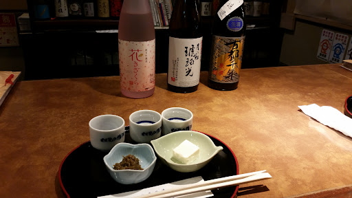 Read moreOur sake journey continued at Ginjo Shubo Aburacho, a liquor store with a small bar where you can sample sake. The staff was knowledgeable and guided us through a tasting of three different sake varieties. The sake labels can be a bit confusing, with two percentages listed—the higher number (e.g., 60%, 40%) refers to how much of the rice grain is polished away, while the lower percentage indicates the alcohol content (15%-18%). I went for the “matured & rich” (umami) palette, while Jasper chose the “light & smooth” and “rich (umami)” options. Everything was served with a delicious side of smoked, root-like vegetables. A must-visit for sake enthusiasts!