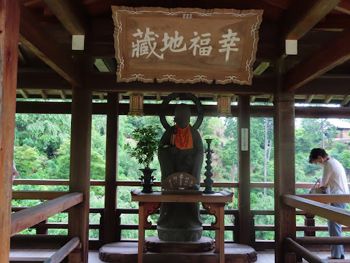 自分以外の幸せを願う、幸福地蔵さま(^^) たまにはいいかもしれません❗️ これは江戸幕府5代将軍徳川綱吉の母の桂昌院が幸せを願い拝んだといわれるもので、お寺自慢のあじさい苑に隣接する清水寺の舞台と同じ「懸け造り」のお堂の中に祀られています。通常仏像は内側を背にしていますが、この仏像...