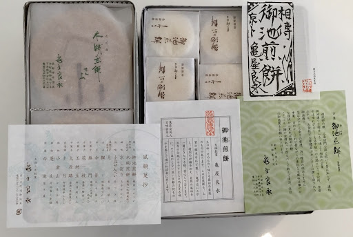 亀屋良永 岐阜より上洛、菓子商での修行を経て、天保3年(1832年)に『大文字屋庄三郎』として創業いたしました。菓業に励む中、嘉永7年(1854年)には上菓子屋仲間 248件 の内に数えられるようになり、万延元年(1860年)には『亀屋庄三郎』に屋号を改名いたしました。時代が下り、第二次世界大戦中には御池通り拡幅工事の為、強制疎開に遭い店舗の取り壊しを余儀なくされております。昭和27年(1952年)に苦労の末、寺町御池の地に店を構えることができ現在に至ります。代表銘菓『御池煎餅』は、いつまでも飽きない素朴な味と共に、版画家 棟方志功 氏によって手掛けられたラベルとしても知られております。 菓心求道 物堅い有職、いかめしい故實もさる事ながら、 美しい京都の、床しい日本の風物をかみしめ尚新しくありたいもの 夏は涼しく、冬暖かに、時雨をきかせ、わづらひの世から去る 心の一時 そんな事も思ひながらの商賣冥利を喜び励んで居ります。 (同社HPより) Yoshinaga Kameya After traveling to Kyoto from Gifu and training at a confectionery shop, he founded Daimonjiya Shozaburo in 1832. While working hard in the confectionery business, in 1854 he became one of the top 248 confectioners, and in 1860 he changed the shop name to "Kameya Shozaburo". I was. As time went by, during World War II, due to the construction work to widen Oike-dori, the store was forced to evacuate and had to be demolished. In 1952, after a lot of hard work, I was able to set up a store in Teramachi Oike, and it continues to this day. The representative confectionery "Oike Senbei" is known for its simple taste that you will never get tired of, as well as the label created by the woodblock artist Shiko Munakata. confectionery In addition to his stubborn job and stern history, Something that wants to be new while savoring the beautiful scenery of Kyoto and the pleasant Japanese customs Cool in the summer, warm in the winter It's a moment in my heart, and while I'm thinking about it, I'm happy to be happy with my business. (From the...