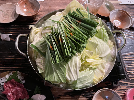 お料理は、白味噌もつ鍋・馬刺し・ホルモンぎょうざ・ジェラートを食べました。 もつ鍋は野菜たっぷり、もつはぶりんぶりんで食べ応えありとっても美味しかったです。 馬刺しも歯応えしっかり、臭みもなく美味しかったです!タテガミという部位もあり、噛むととろけるような食感でとても美味しかったので是非食べてほしいです♪ ホルモンぎょうざ・ジェラート(桃、ゆず、抹茶の3種から選びました)も美味しかったです。