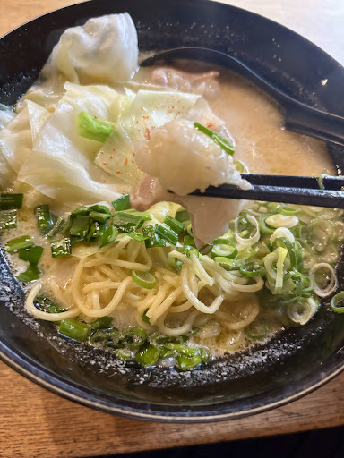 細めのストレート麺はもっちりと歯応えを楽しめる秀逸なもの、 ネギとわかめといったシンプルなトッピングがこのラーメンには合っている。