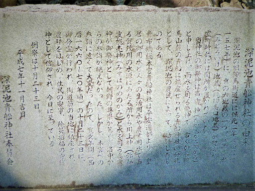 Read more「深泥池貴舩神社の由来」1995年 深泥池の旧鞍馬街道には保元二年(西暦一一五七年)に、京の六地蔵の一つ、御菩薩池(みどろいけ)地蔵(現鞍馬口地蔵)が祀られ、室町時代には関所が置かれていた。当神社の御祭神は高龗神(たかおかみのかみ)と申し上げ、雨水を司る龍神で、古くから鞍馬山麓の貴船に鎮座せられる貴船神社の分社として、深泥池の農民によって、勧請したものである。 貴布禰総本宮貴船神社は平安遷都より、皇居の御用水と人々の生活用水や農業用水である賀茂川の水源にあたる所から川上神(弥都波能売神/ミズハノメノカミ)と水を司る高龗神が御祭神として朝野の尊崇が篤く、洛中からの参詣が絶えなかった。しかし、本宮への参詣に遠くて大変だったので、寛文年間(一六六〇~七〇年頃)の十月二十三日に御分霊が行われ、街道筋の当地に鎮座され 農耕をはじめ、住民の安寧、除災招福の守護神として信仰され、今日に至っている。(深泥池貴舩神社奉賛会 境内説明板) "Origin of Midorogaike Kibune Shrine" 1995 In the second year of Hogen (1157 AD), one of the six Jizo in Kyoto, the Midoroike Jizo (currently Kuramaguchi Jizo), was enshrined on the old Kurama Kaido in the Midorogaike, during the Muromachi period. There was a checkpoint. The deity of the shrine is called Takaokami no Kami, and it is a dragon god who controls rainwater. is there. From the Heian-kyo relocation, Kifune Shrine is the water source of the Kamo River, which is the water for the Imperial Palace, people's daily life, and agriculture. Asano was revered as a god of worship, and the worship from Rakuchu was constant. However, it was difficult to visit the main shrine, so a spiritual deity was held on October 23rd of the Kanbun era (around 1660-70), and it was enshrined here along the highway and began farming. It has been worshiped as a guardian deity for the well-being of residents and the blessing of disaster relief, and continues to this day. (Mizorogaike Takafune Shrine Supporting Party Precincts...