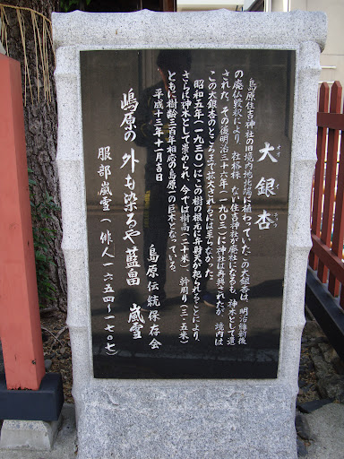 服部 嵐雪(はっとり らんせつ、承応3年(1654年) - 宝永4年10月13日(1707年11月6日))は、江戸時代前期の俳諧師。幼名は久馬之助または久米之助、通称は孫之丞、彦兵衛など。別号は嵐亭治助、雪中庵、不白軒、寒蓼斎、寒蓼庵、玄峯堂、黄落庵など。松尾芭蕉の高弟。雪門の祖。(出典:ウキペディア) Stele: big ginkgo Shimabara's Great Ginkgo Tree This ginkgo tree, which was planted at the northern end of the former precincts of Shimabara Sumiyoshi Shrine, was left as a sacred tree even though Sumiyoshi Shrine, which had no shrine status, was closed due to the anti-Buddhist movement after the Meiji Restoration. After that, the shrine was rebuilt in 1903, but the precincts only extend to this ginkgo tree. It didn't get expanded. In 1930, when Benzaiten was enshrined at the base of this tree, it became even more revered as a sacred tree, and now, with a height of 20m and a trunk circumference of 3.5m, it is the largest tree in Shimabara, corresponding to its age of 300 years.