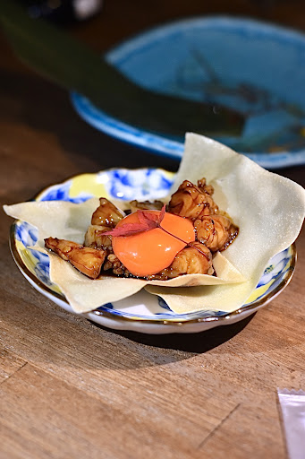 【生海老のパリプリxo醬】880円 海老の生感がやばい❗️とろとろ〜❗️ とろりとした卵黄と中華のあじつけ! こりゃーすごい!