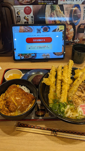 平日のちょうど12時あたりに到着したが、駐車場は凄まじい行列で、中に入っても整理券を取る必要があり、また行列。 とはいえお店の回転は非常に早く、すぐに自分の番号が来た。前から5番目くらいなら十分以内には呼ばれる。 席に着くとならんだ割には意外にも空席が目立つ。おそらく従業員不足から席数などを制限しているのだろう。 注文は席でタブレットから行う形で、注文してからすぐにうどんが来た。ここにも回転率の高さが垣間見える。 並びはするが回転率の高さでそれほど待たな...