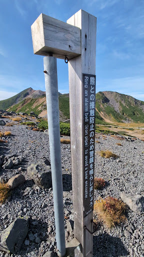 Read more2025/9 乗鞍岳では登れる山が剣ヶ峰を含んで四座あります。その中でもお気に入りなのがこちらの大黒岳。山頂からは富山側の穂高、槍が丸見えです。山頂付近は平らなスペースが広くまるで公園です。屋根がついたベンチがある休憩所のようにスペースもあります。 また、麓からは黒くて大きな岩の塊が見えます。この岩が名前の由来でしょうか。 前日、肩の小屋に宿泊したこともあり、日の出は剣ヶ峰で迎えましたが、朝食を食べて、富士見岳経由でこちらにやってきました。まだ観光バスがあまり来ていない時間にこれたので、山頂付近は誰もいないでとても気持ちの良い場所でした。クマが出てきたらどうしようと思いながら階段を登って行きました。 熊避けの鐘を一人で鳴らしてました。