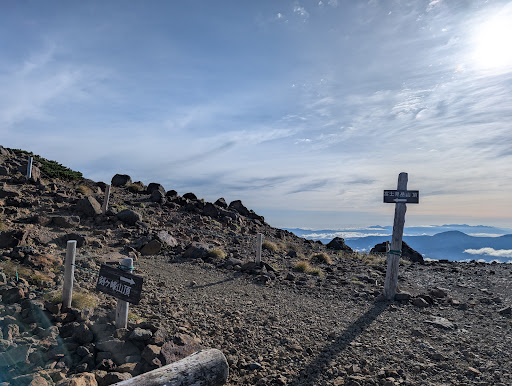 Read more2025/9 前日に、肩の小屋に一泊して剣ヶ峰の日の出を見てから朝ご飯を頂き小屋を出発。畳平方面に歩いていく際に登りました。 実は乗鞍岳は2回目で前回もこの山だけは登りました。前回はロードバイク装備ということもあり、シューズもトレッキングシューズではなかったので畳平からドカンと鎮座していた大黒岳か富士見岳か選んでこちらに。 肩の小屋側から登ったのである意味初です。 まだ朝早かったこともあり誰ひとりおらずとても清々しい山頂付近。剣ヶ峰で散々山頂景色を満喫したので今回は通過です。