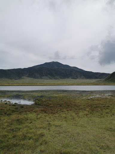目前に広がる草原は 「草千里」と呼ばれ、 烏帽子岳の側火山として活動した千里ヶ浜 火山の火口跡です。 千里ヶ浜は浅い二重の火口で直径約1kmに達します。 内側の火口 は草千里の東側凹地で、 南北に約500m、 東西に約250mのだ円形をしています。 草千 里中央の小高い丘は「駒立」といい、 内側火口の縁の一部です。