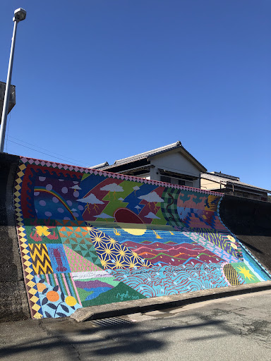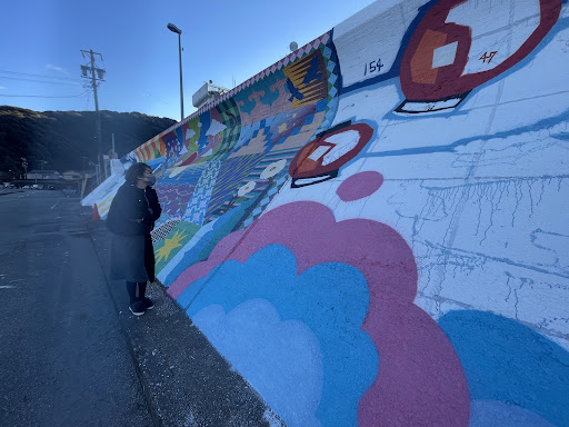 It is the best mural I have seen in Asia so far. I loved the way the artist Yoh Nagao uses cultural themes and folk stories to include in his imagery. This one is just amazing - and the longest mural on a seawall all over Japan! There should be more artworks like this on the grey seawalls to...