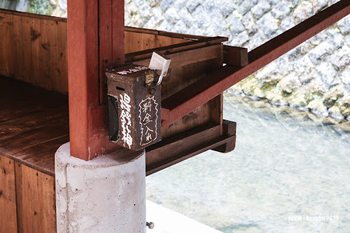 【 入浴 】 温泉の上に掛かっている庇の裏手が脱衣場となっています。 横方向からは丸見えですが、対面の車道からは見えません。 入浴料は200円、箱に投入するタイプですので、お釣りが出るわけではありません。100円玉を2枚用意して行きましょう。