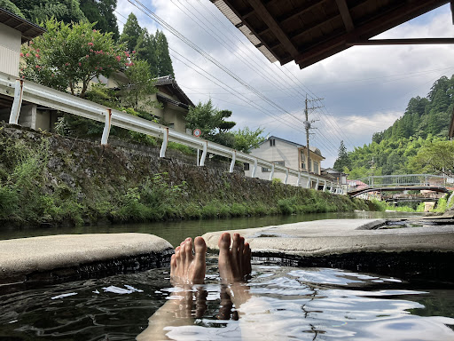 単純泉で臭気もほぼ無いため、泉質云々よりも、川面のせせらぎや山村の生活感をしみじみ味わいながら、風情を楽しむ温泉です。 トンボが浴槽のへりに停まるのを目で追ったり、ハヤ(オイカワ)が川中を泳ぐのを眺めながら湯に浸れます。 よく晴れた日に入浴すると、川面にきらめく陽光が、庇の裏側に反射してゆらゆらとうごめくのを見ることができます。うまく撮影できませんでしたが、ぼーっと眺めていられる自然のゆらぎです。(入浴の際は、庇(天井)を見上げてみるのもお忘れなく)