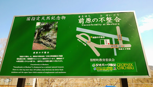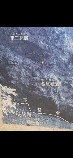 母屋の横階段を下りて行くとあります。 地層になっていますが、説明文見てないと、区別がつきません 素人には分かりにくいです。 崖の左下に見える黒い岩石が秩父帯のチャートなどでおよそ、一億五千万年前の地層になっているそうです。 ...