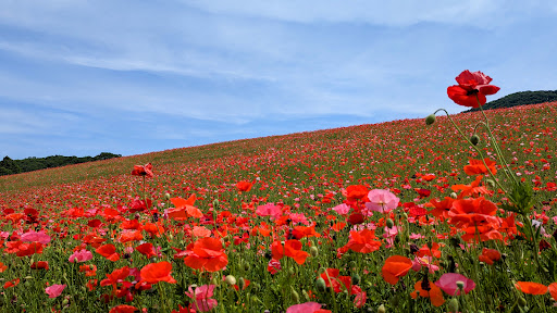 Read more最高です。 華やかなポピーと青い空の対照が見事です。適度な起伏がもたらす景観の変化ゆえ長く見ていても飽きません。Googleマップの口コミ数は二〇二三年五月時点でわずか二桁、知名度はまだまだのようですが、羊山公園の芝桜の丘、国営ひたち海浜公園のネモフィラなどと比べても遜色のない見ごたえです。藤と躑躅の後、菖蒲と紫陽花の前に見頃を迎えるので、どちらを見に行こうかと悩まずにすむのも良い点です。 車で来れば駐車場への入場待ち、公共交通機関なら皆野駅まで秩父鉄道に揺られて、そこからさらにシャトルバスとなります。二週間ほどの季節限定の名所ゆえトイレは仮設、屋台以外に飲食店も物販店もありません。不便なところですが、わざわざ足を運ぶだけのかちは十二分にあります。徒歩圏には本当に何もないものの、少し足を伸ばせば長瀞と宝登山神社、銭神様を祀る聖神社があります。秩父まで行けば秩父神社に三峯神社、熊谷には国宝の妻沼聖天があります。一泊二日の旅程を満たすには十分すぎるぐら...