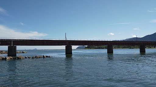 Read more京都府北部を流れる由良川の河口に架かる橋梁です。 1923年に建設された橋で、全長が551mと長く、桁下高約3mと水面との距離が近いうえに橋の構造もシンプルなので、列車で走るとあたかも水面を走っているような感覚が味わえます。 鉄道建設当初はもっと由良川上流に架けられる予定でしたが、橋脚設置による洪水の懸念があり河口部へ長い橋を架けるルートに変更されたそうです。 撮影スポットとしても有名なようで、訪れたのは夏休みの平日で天気も良くありませんでしたが、午前中から多くの方が橋と列車の写真を撮られていました。