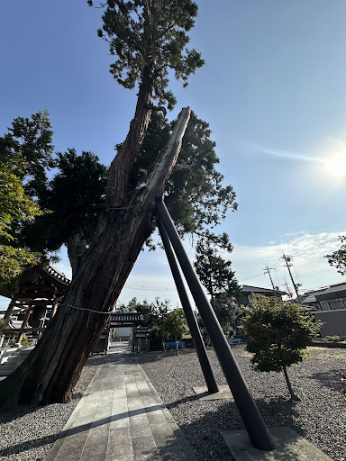 Read more大杉は、南に開いた参道石畳の東。大きく西に傾き、それを支える支柱とで参道を跨ぐ三角形を形作っている。 根元の様子から判断すると、本来は直立していたものが、横向きの大きな力を受けて、東側の...