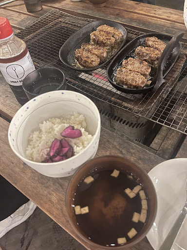 炭火の前でハンバーグを焼く音と香りがたまりません!