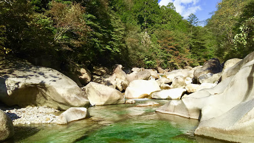 柿其渓谷の越路橋附近は簡単に河原までたどり着くことができますがそこから上流は河原にたどり着くことも困難です。ねじだる周辺は越路橋附近についで河原までたどり着くことができるポイントです。牛ヶ滝の遊歩道より遙かにワイルドで整備されてませんが、屋久島のような苔むした森を通過しますので苔マニアやジャングル大好きなサバゲーマーにはたまらないとおもいます。