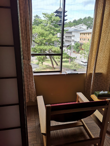 It's a 10 minute walk from Kintetsu Nara Station and 15 minutes from JR Nara Station. It's right on a pond and there are deer that come right up to the hotel. It's right by the steps that go up to a nice shrine, an old pagoda, and two museums. It's also right by the main shopping arcade. It's basically the perfect location for a vacation in Nara.