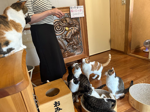 そして『猫を見に来たのでしょうか』と聞かれ、参拝や御朱印を頂く他、御朱印帳も購入したかったり、他の目的もありましたが、猫ちゃんにも会いたかったので『はい』と答えました。 すると、淡々と猫への接し方ルールを説明され、玄関は上がらずそこの下から見るよう指示。
